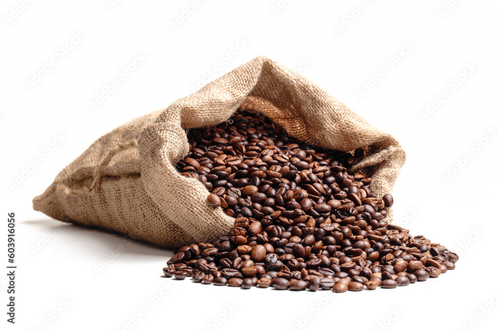 Obrazy Kawa - Palone ziarna kawy w jutowym worku na białym tle #603916056