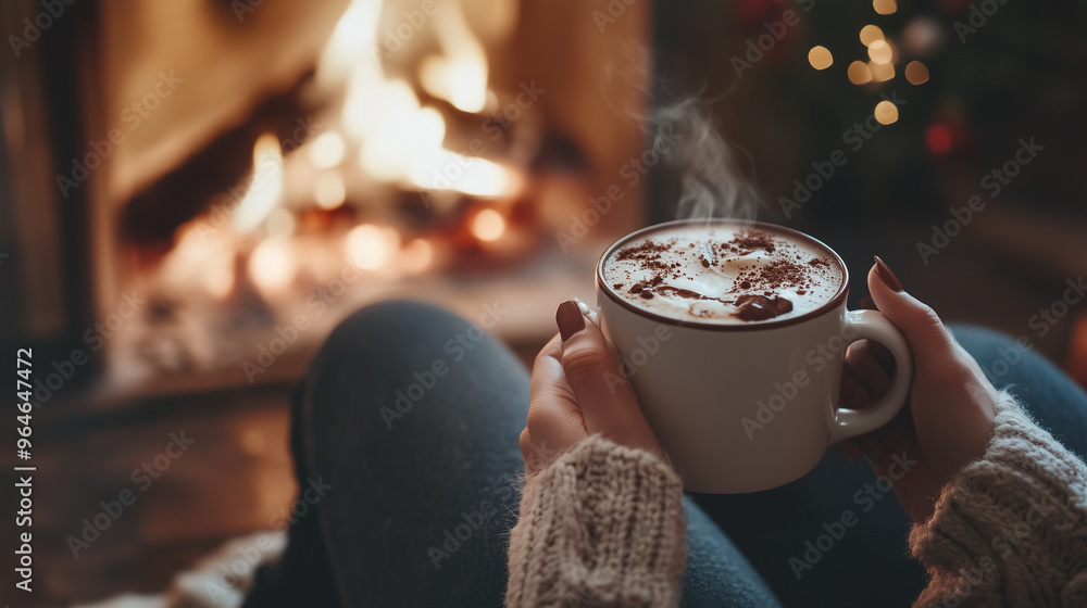 Obrazy Kawa - Kobieta odpoczywa przy kominku, trzymając w rękach kubek gorącej kawy lub czekolady. Ogniste... #964647472