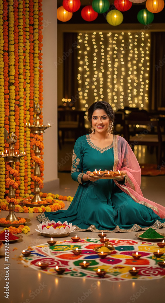Obrazy Sport - young indian woman celebrating diwali festival together at home #1719766920