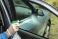 Dłoń mężczyzny nanosi płyn do mycia szyb na szybę samochodu.