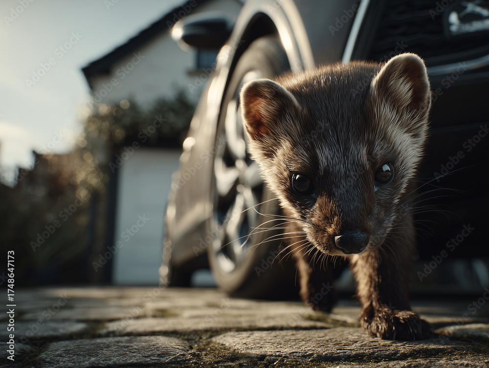 Obrazy Auta - Zbliżenie na młodą kunę, która wyłania się spod zderzaka ciemnego samochodu. Stoi na brukowanym... #1748647173