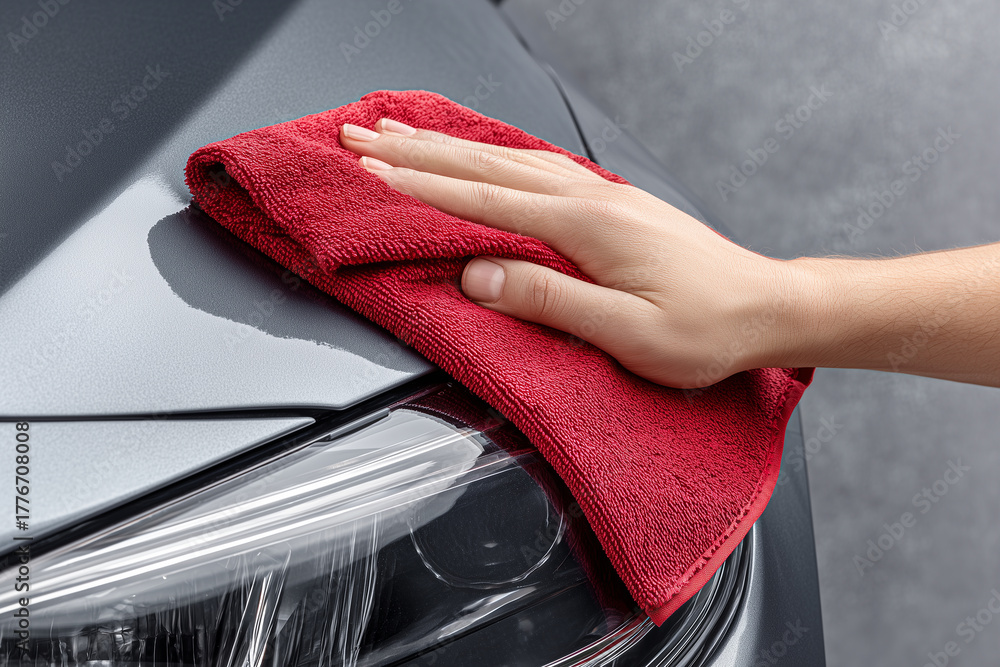 Obrazy Auta - Ręka polerująca czerwoną ściereczką z mikrofibry lakier samochodu w okolicy reflektora,... #1776708008