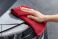 • Ręka polerująca czerwoną ściereczką z mikrofibry lakier samochodu w okolicy reflektora, symbolizująca mycie i detailing pojazdu.