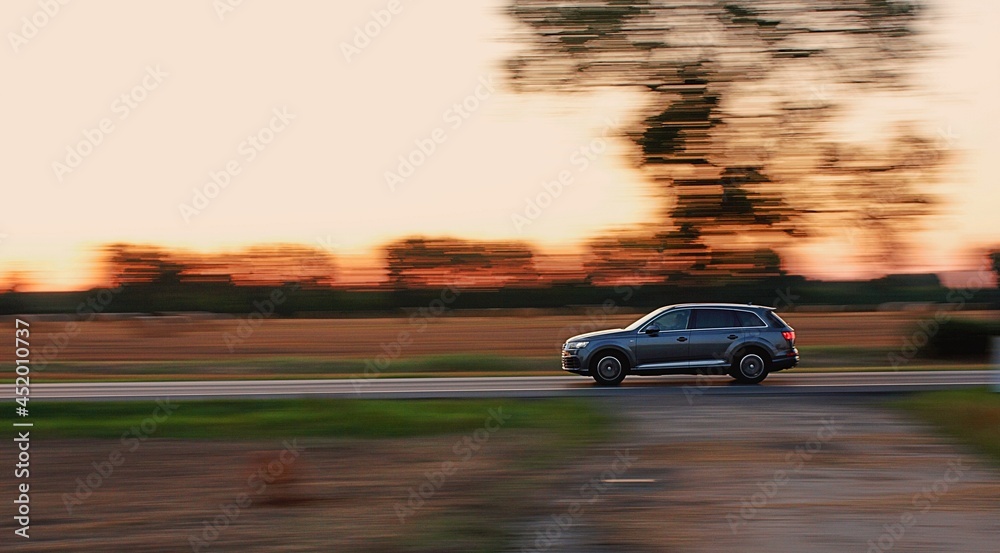 Obrazy Auta - Samochód na drodze o zachodzie słońca #452010737