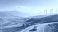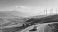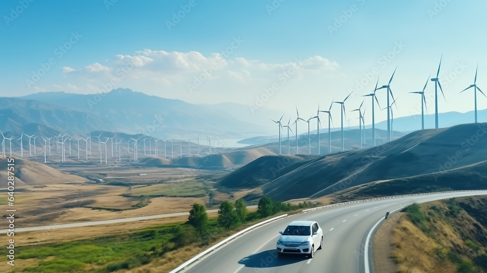• Car drives along a mountain road against the backdrop of wind turbines. Alternative energy for the car. An electric car against the backdrop of wind turbine farms