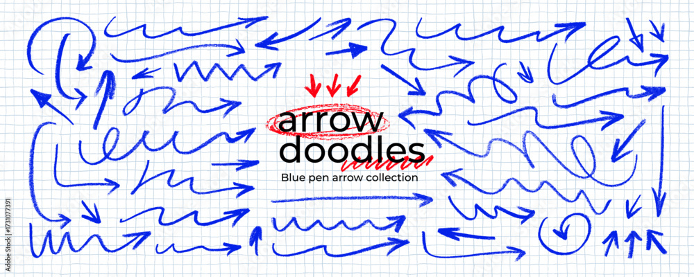 • Blue pen arrow collection on checkered paper sheet. Hand drawn crayon various arrows, curved, wavy and straight lines. Direction pointers for notes, doodle and school design. Playful emphasis elements