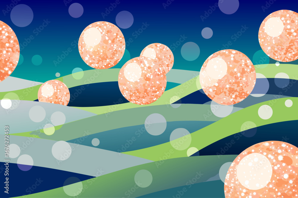 • Wesoła, abstrakcyjna ilustracja z brokatowymi bańkami nad zielonymi falami. Tło dla dzieci, symbolizujące zabawę.