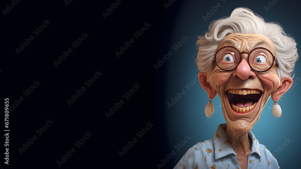 Obrazy dla Dzieci - Mature woman with eyeglasses having a big smile, 3D cartoon illustration, isolated on a dark blue... #671809655