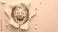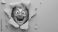 • A crazy laughing grandma looks through a hole in a yellow wall, smiling, cartoon illustration