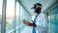 • Doctor wears VR headset in hospital hallway. Man uses virtual reality tech for medical training or patient care. Future of medicine innovation exploring digital health.