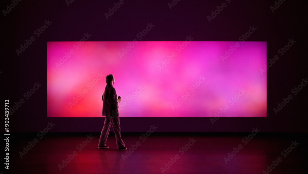 • Vibrant artwork woman observing glowing abstract color panel. Concept of contemporary art exhibition, emotional perception, creative inspiration, modern editorial and branding visuals.