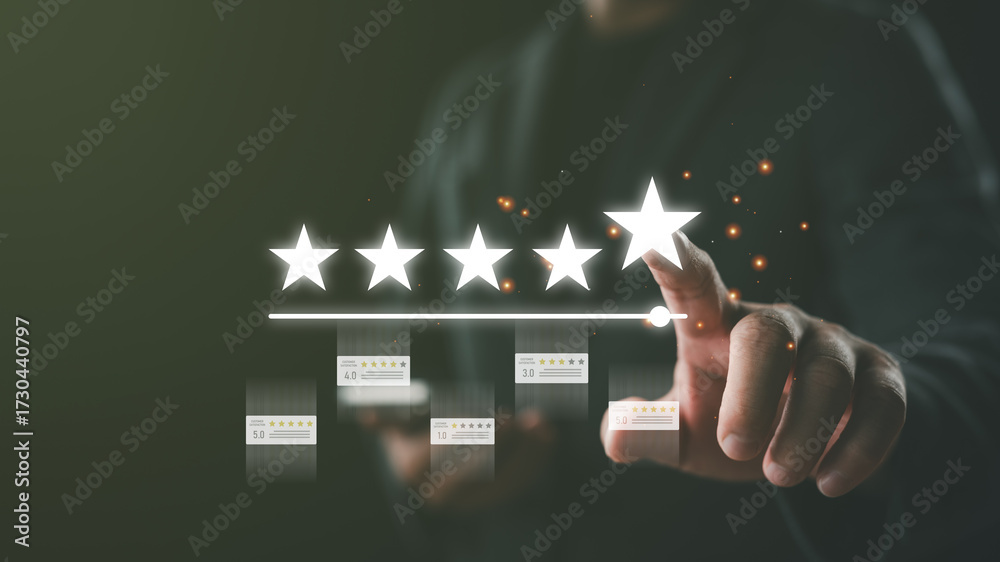 • Hand giving five star rating on virtual interface, symbolizing excellent customer satisfaction, online review system, feedback evaluation, and business reputation management.