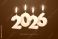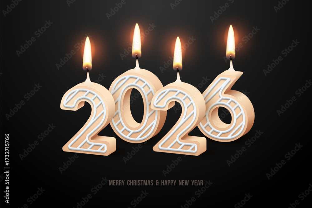 • 2026 Happy New Year greeting card vector background. 2026 candle beige numbers with fire on black. Festive sparkle holiday postcard, invitation, banner for social media.