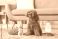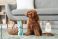 • Cute Toy Poodle dog with wicker basket of Easter eggs and toy rabbit sitting on carpet in living room