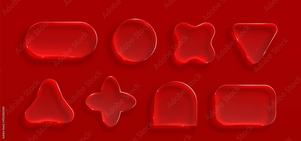 • Transparent glass frames with glossy morphism effect, vector set isolated on red background. 3D ui elements with realistic texture, rounded corners, crystal clear borders for modern digital interface