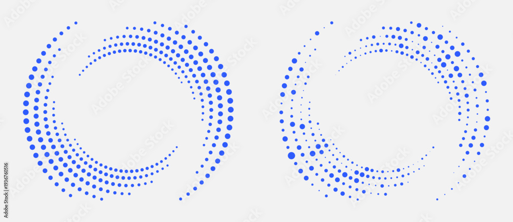 • Abstract blue halftone spiral dots on light grey background. Vector vortex for technology, data flow and AI concepts. Radial graphic design element for modern projects.
