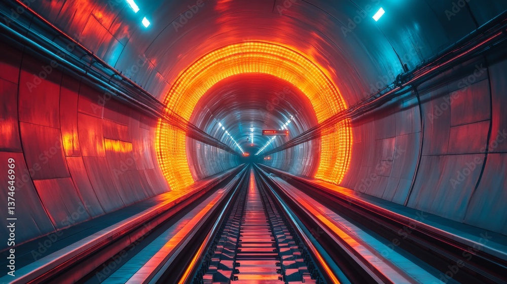 Obrazy Miasto - Inside a high speed railway tunnel, vibrant illuminated patterns appear along the walls,... #1374646969