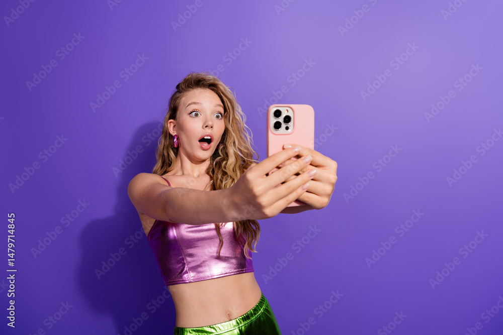 • Stylish young woman captures a surprise moment with her smartphone against a vibrant purple background.