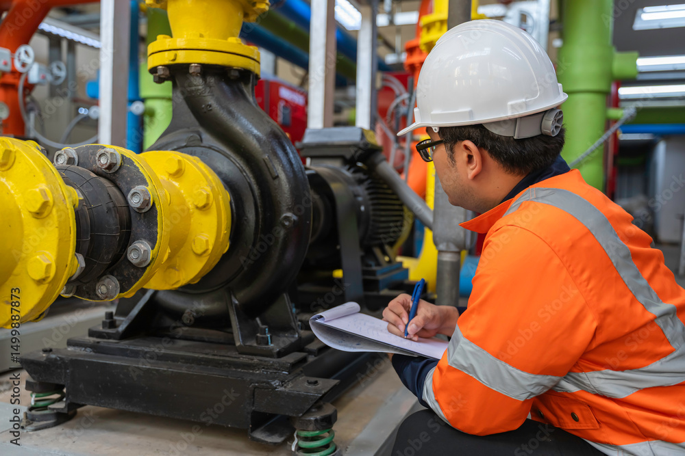 Obrazy Miasto - Asian engineer wearing glasses working in the boiler room,maintenance checking technical data of... #1499887873
