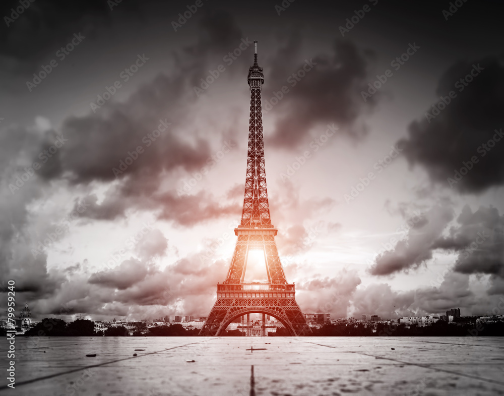 Obrazy Paryż - Effel Tower, Paris, France. Black and white with red sun light #79959240