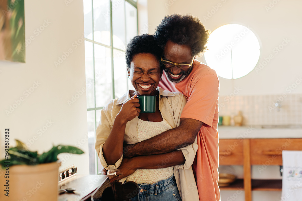 Obrazy Rafa koralowa - Mature man making his wife laugh in a tight hug at home #1508517332