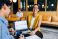 Obrazy Rafa koralowa - Smiling professional woman discussing a project in a modern office setting #1705819955
