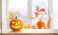 • Orange jack o lantern pumpkin on wooden table with copy space over blurred window sill background with traditional Halloween house decoration