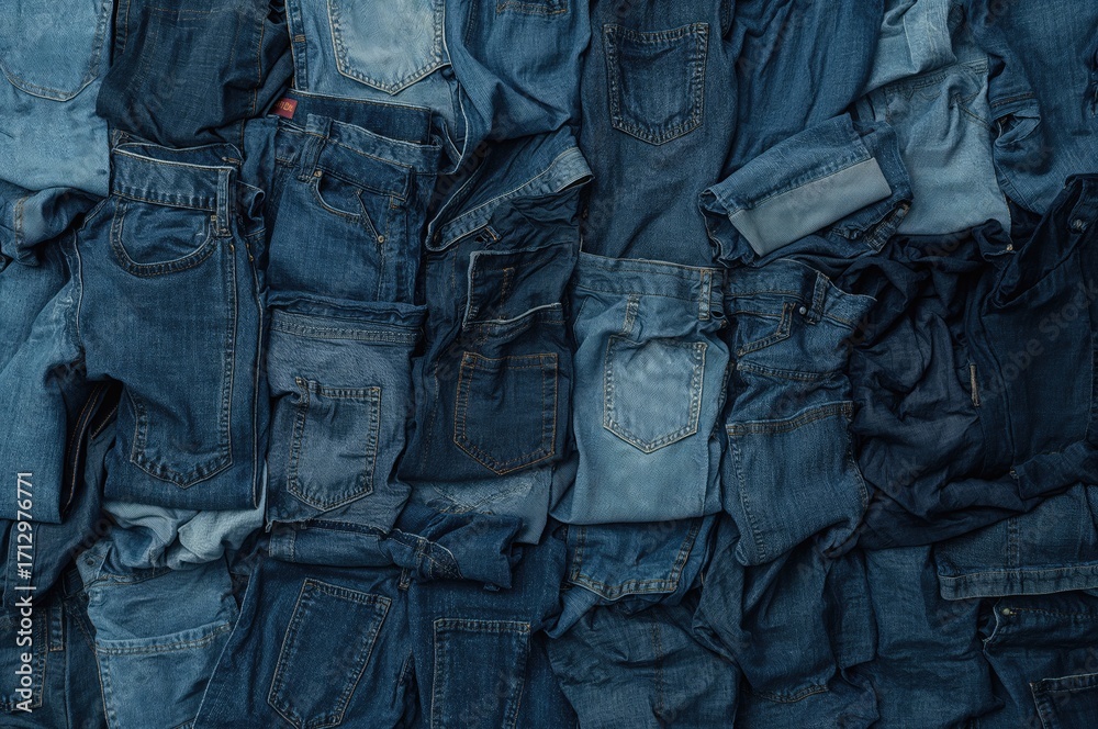Obrazy Rafa koralowa - Overhead view of stacked denim pants #1712976771
