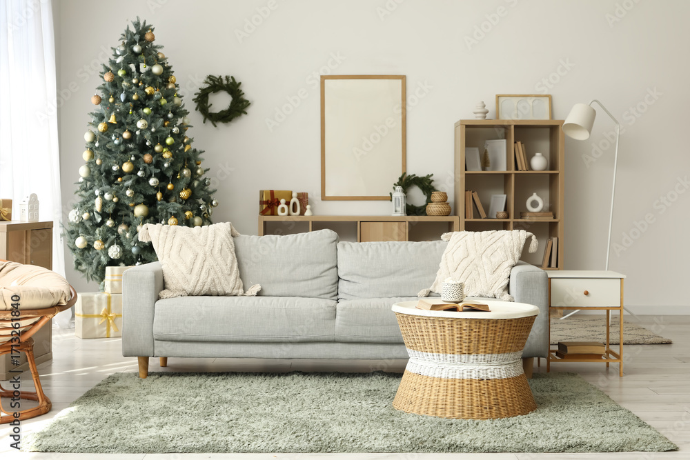 Obrazy Rafa koralowa - Interior of light living room with sofa, bookshelf and Christmas tree #1713261840