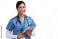 • Doctor, tablet and woman in portrait isolated on transparent, png background for telehealth service or paperless management. Happy face of medical worker, nurse or person with digital technology