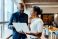 • Colleagues discussing a project using a laptop in an office setting