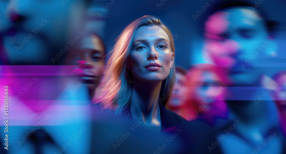 Obrazy Rafa koralowa - Confident businesswoman in focus as crowd blurs in blue and magenta lighting #1733116440