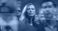 • Confident businesswoman in focus as crowd blurs in blue and magenta lighting
