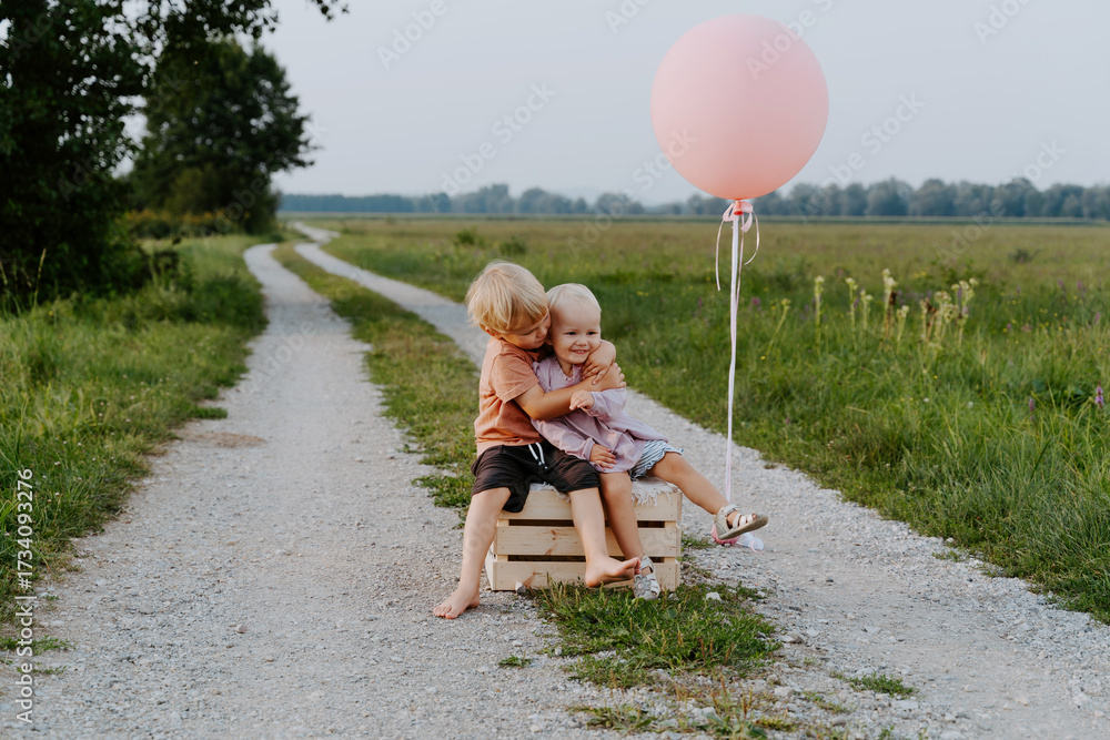 • Brother and sister sitting together on wooden box in countryside. Happy siblings in nature. Portrait of little girl and boy. Children birthday party, outdoor nature photoshoot with festive atmosphere.