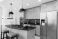 • A contemporary kitchen features light wood cabinets, black granite countertops, a black subway tile backsplash, and a large island with bar stools. No brands or labels.