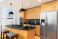 Obrazy Rafa koralowa - A contemporary kitchen features light wood cabinets, black granite countertops, a black subway... #1960953694