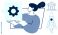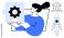 • Woman holding a gear-shaped puzzle piece with a rocket and bank icon nearby. Ideal for innovation, teamwork, problem-solving, technology, business strategy, finance, startup concept. Simple flat