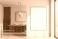• Modern dining room interior with large blank poster mockup on clean white wall, featuring wooden furniture and natural sunlight view through window. 3D Rendering