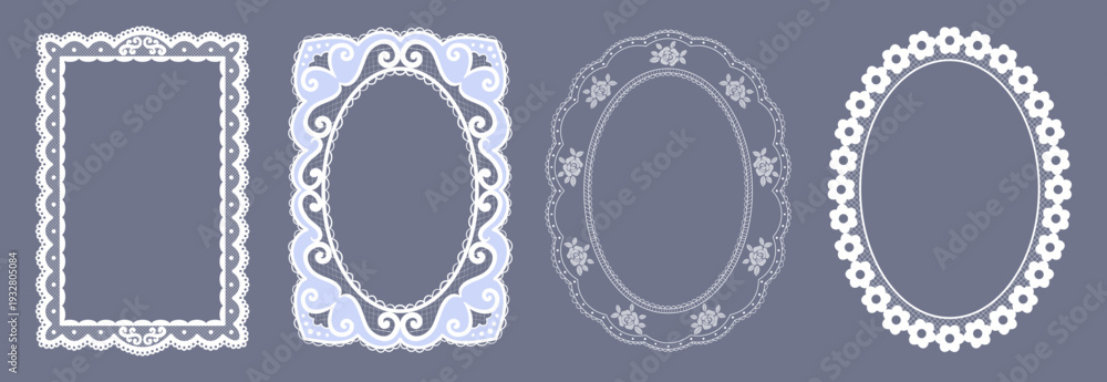 Obrazy Niebo - Set of ornate lace frames and doilies with swirls and floral details. White crochet border... #1932805084