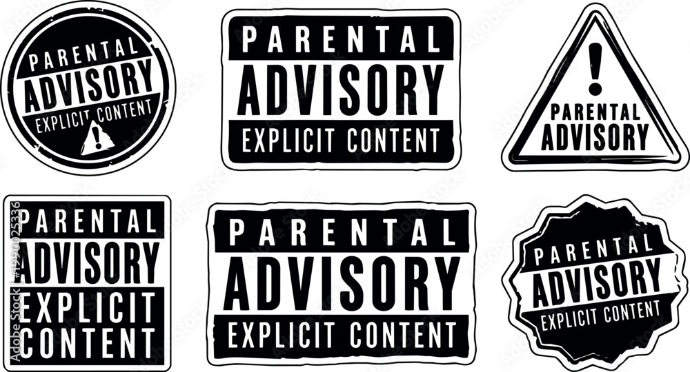 • Black and white parental advisory explicit content label vector set with varied shapes