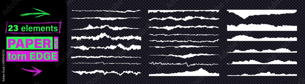 • Jagged torn paper rip edge effect on white recycled texture sheet. Vector collection of page piece blank card tag label banner divider element claw cut line. Cardboard tear edge clipart kit bundle.