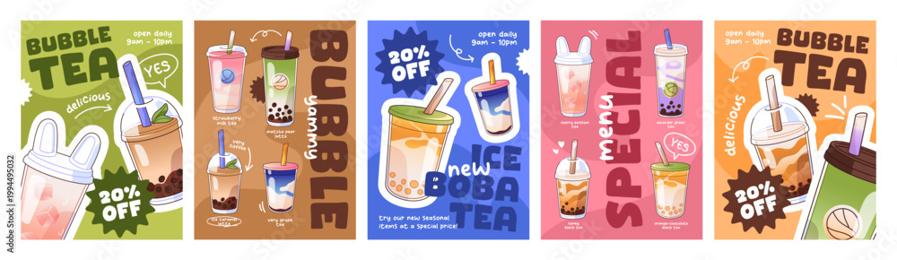 • Advertising posters of bubble tea set. Designs of promotion of soft drinks with tapioca. Menu templates with glasses of cocktails, beverages with matcha, coffee, taro. Flat vector illustrations
