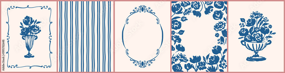 • Set of cards, covers, patterns with hand drawn cute flowers, vases, stripes. Naive, simple art design. Spring, summer botanical vector illustration. Cottagecore, country vintage style.