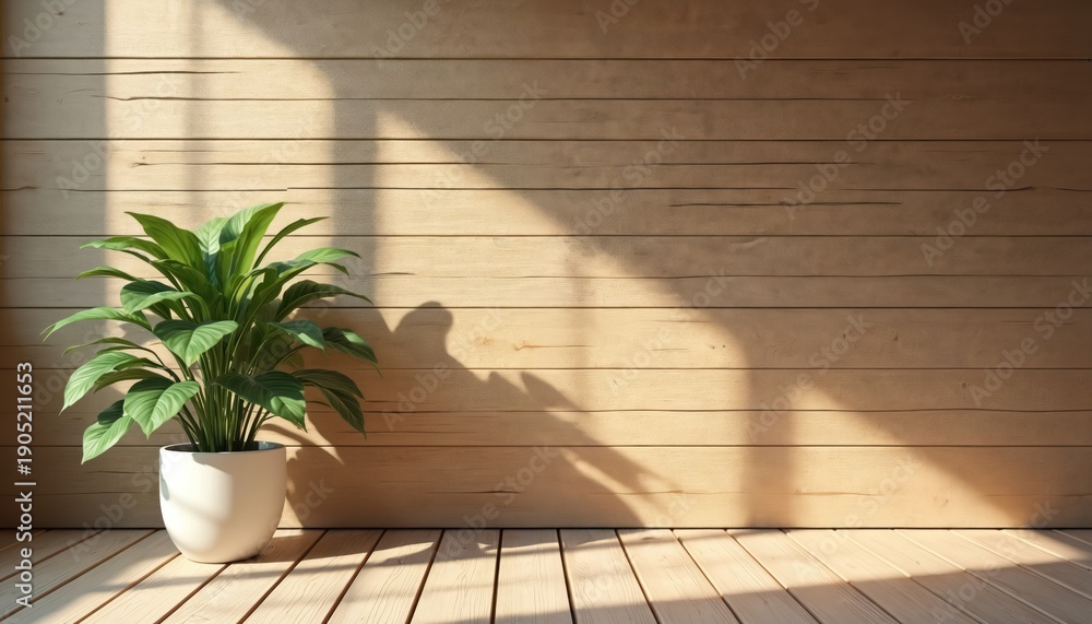 • Potted green plant sits on light wood floor in front of wood paneled wall. Sunlight casts shadows creating serene indoor atmosphere. Minimalist decor.