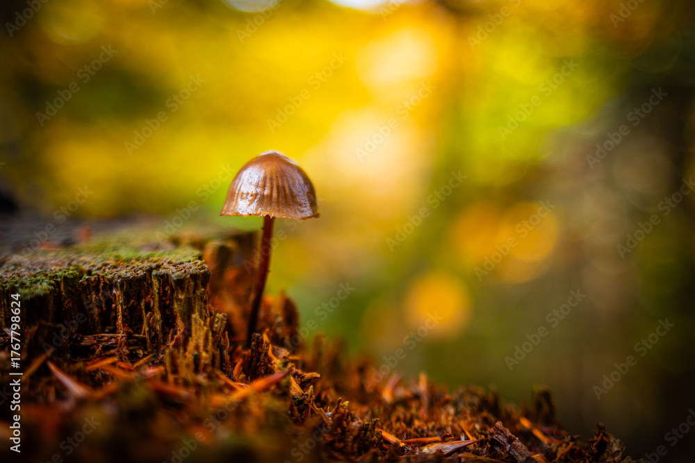 Obrazy Makro - Grzybek z rodziny grzybówka w jesiennej scenerii z rozmytym tłem #1767798624