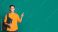 • Teen student with books pointing on copy space against turquoise background