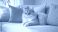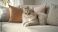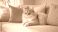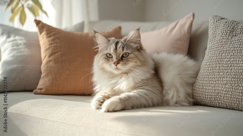 • Fluffy white cat lounging on beige couch with pastel pillows