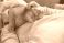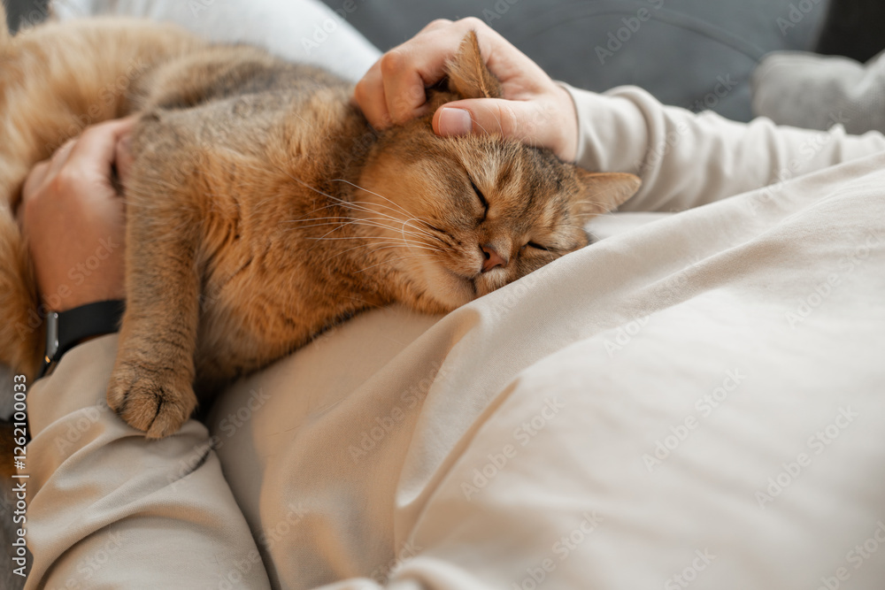 • Closeup view of Golden Chinchilla cat happily sleeping on man's chest