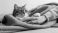 Obrazy Koty - A hand gently touches a cat lying on a cozy blanket. #1534379961