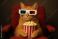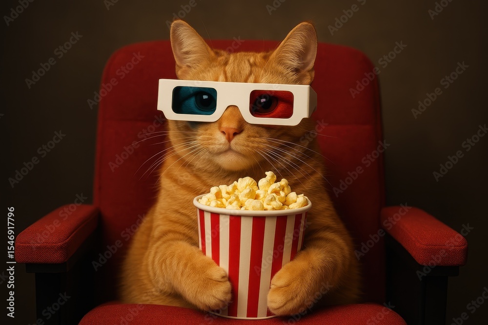 • Adorable cat wearing 3D glasses sitting in red theater chair with popcorn enjoying movie entertainment experience